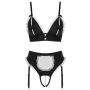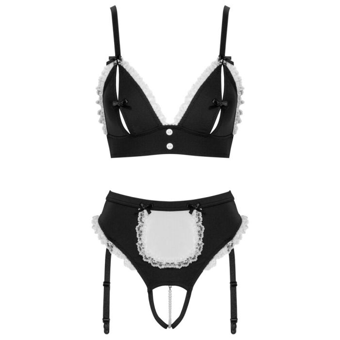 Maak je klaar om de show te stelen met de 2-delige Serveerster set van Cottelli COSTUMES! Dit verleidelijke ensemble in een sensuele open look bestaat uit een bustier en jarretel, beide uitgevoerd in een elegante zwarte kleur met speelse witte franje details en schattige zwarte sierstrikjes. De bustier is niet alleen een lust voor het oog, maar ook praktisch met kleine knoopjes tussen de opengesneden cups, die elk bij elkaar worden gehouden door een decoratief strikje. De verstelbare bandjes zorgen voor een perfecte pasvorm, terwijl het jarretelkoord met een schortje aan de voorkant en een stimulerende parelketting in het open kruis je look compleet maakt. Met vier verstelbare en volledig afneembare jarretelbandjes kun je de set helemaal naar jouw wensen aanpassen. Dit is de perfecte outfit om je innerlijke serveerster naar boven te halen en een onvergetelijke indruk te maken!