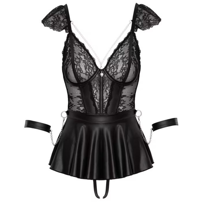 Deze set bestaat uit een betoverende babydoll, een kruisloze string en zachte handboeien, allemaal ontworpen om je fantasieën tot leven te brengen. De stijlvolle mix van delicaat kant en een coole matte look, aangevuld met zilverkleurige accessoires, zorgt voor een luxe uitstraling. De babydoll is niet alleen prachtig, maar ook praktisch met afneembare kettingen en een schattige hartjeshanger tussen de kanten beugelcups. De verstelbare bandjes met delicate kanten volant en de haaksluiting op de rug bieden een perfecte pasvorm, zodat je je zelfverzekerd en sexy voelt.