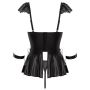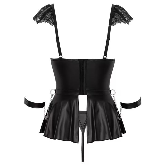 De uitlopende rok in matte look voegt een speelse flair toe en heeft een handige ring aan de zijkant van de taille, waar je de bijgevoegde handboeien met karabijnkettingen aan kunt bevestigen. De zachte bandjes zijn eenvoudig aan te trekken met hun klittenbandsluiting en kunnen snel op maat worden versteld voor optimaal comfort. De bijbehorende string met een verleidelijk open kruis maakt de fantasierijke bondagelook compleet en laat niets aan de verbeelding over.