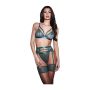Je sexy voelen begint aan de binnenkant, maar het kan nooit kwaad om ook de buitenkant net zo sexy te maken! Deze driedelige set, ontworpen in smaragdgroen, zal jou lichaam doen stralen! De set bestaat uit een doorschijnende bralette met bandjes waardoor je buste op een natuurlijke manier gelift zal worden. De brallete wordt perfect gecombineerd met de bijpassende jarretelgordel en hoog uitgesneden string. Met het dragen van deze sexy (én comfortabele) look ben jij klaar voor een sensuele avond samen met je lover.