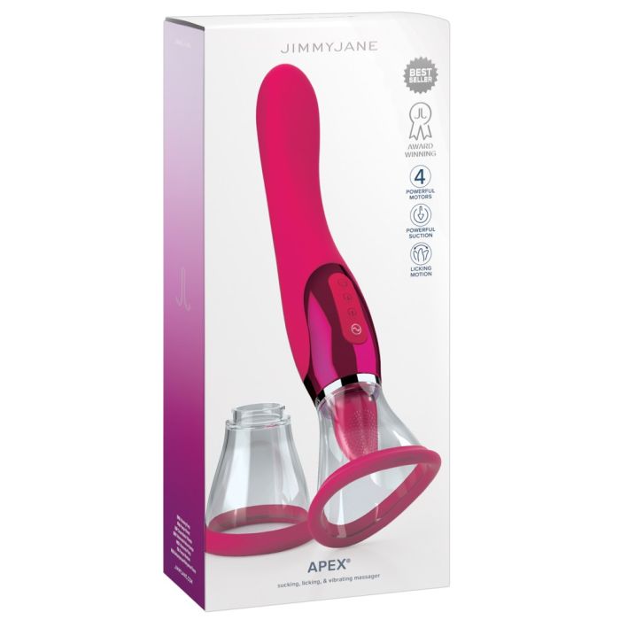 De handige vibrator Apex van JimmyJane is een echte multi-verwenner! Met een combinatie van een intieme zuignap en een vibrerende liktong biedt deze vibrator zowel externe stimulatie als interne G-spot stimulatie. Of je nu alleen bent of met een partner, deze vibrator zorgt voor diepe verwennerij en intense genot.