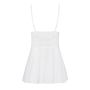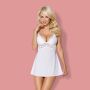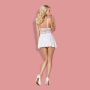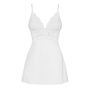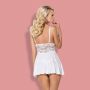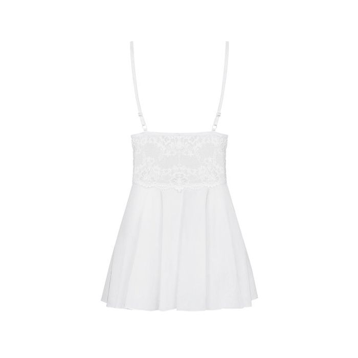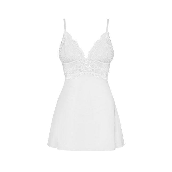 De babydoll heeft beugelvrije en voorgevormde cups voor een mooi gevormde en opvallende boezem. Het kant geeft een romantische uitstraling en vanaf het kant valt witte zachte stof sierlijk rond de heupen en billen. De babydoll heeft verstelbare schouderbandjes en wordt geleverd met een bijpassende string.