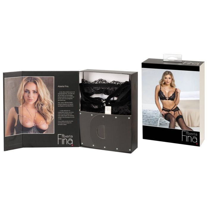 Het Abierta Fina Lingerie Setje Kant - Zwart is gemaakt van doorzichtig kant met een erg charmante uitstraling. De bh heeft kanten cups en een stijlvolle jarretelgordel. De bh heeft verstelbare schouderbandjes en een haaksluiting op de rug. De bijpassende slip laat jouw billen super sexy uitkomen.