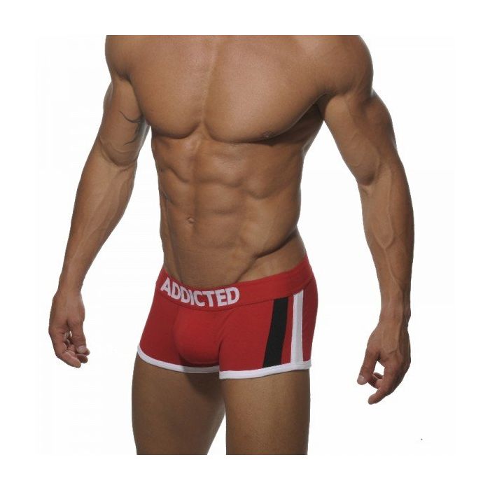 De AD158 Pack Up Boxer van Addicted zorgt ervoor dat jij een zichtbaar welgevormde voorkant zult krijgen. Dat komt doordat Addicted daar hun bekende 'pack-up' systeem in heeft aangebracht. Het pack-up systeem is een uitneembare foam cup die je aan de voorkant in een pouch kunt doen. Hierdoor zit het niet alleen voller uit, maar ook symmetrischer. Verder is de AD158 Pack Up boxershort een low-cut basic square model die zeer populair is. Door het gebruikte materiaal is hij zeer comfortabel om te dragen. Deze AD158 Pack Up Boxer van Addicted heeft als hoofdkleur Rood met witte zomen rondom de benen die aan de zijkanten doorlopen tot aan de tailleband. Tevens zijn er nog extra strepen aan de zijkanten aangebracht in zwart. Het Addicted logo vind je zowel aan de voorkant als aan de achterkant op de tailleband. Verdere verkrijgbare kleuren zijn Navy Blauw, Zwart en Wit.