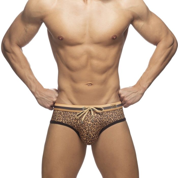 Gemaakt van een stofmix van 80% polyester en 20% elastaan, biedt deze nauwsluitende zwem slip een strakke pasvorm die je figuur prachtig accentueert. De opvallende luipaardprint in verschillende grijstinten zorgt ervoor dat je opvalt aan het zwembad of op het strand. De lage taille en de elastische tailleband met een gestreepte afwerking en rijgveter zorgen voor een comfortabele en veilige pasvorm, terwijl de zachte zwarte zomen een luxe uitstraling geven.