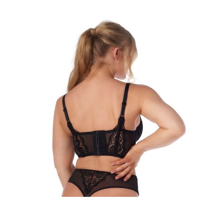 Het zachte stretch kant loopt onder de cups een stukje door voor een elegant design en een aangenaam comfort. De rug is gemaakt van zacht micro mesh en er is een 7 haakse sluiting met 4 standen ingezet. Het mesh wordt onderbroken door sierlijke details van kant.