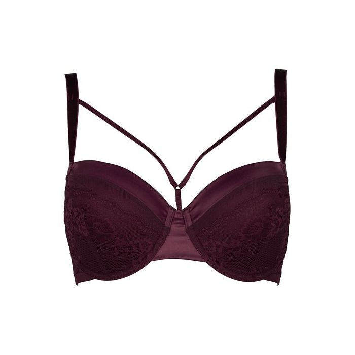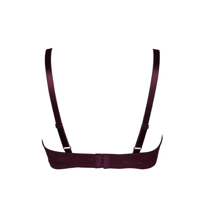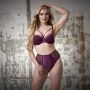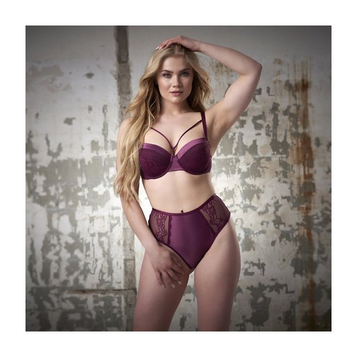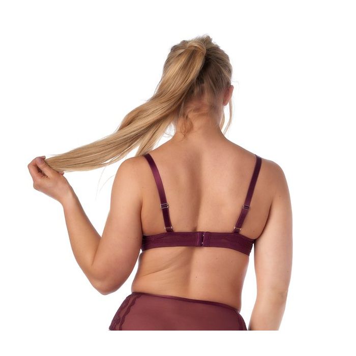 Bh's voor grote maten zijn vaak saai en aan de prijzige kant. Deze bh dus absoluut niet! De cups zijn gemaakt van glanzend, paars satijn en sierlijk, paars bloemen kant. Over het decolleté is een speels bandje aangebracht. Het bandje accentueert de borsten, maar kan ook makkelijk verwijderd worden. De schouderbandjes zijn verstelbaar en op de rug is de bh voorzien van een handige haaksluiting.