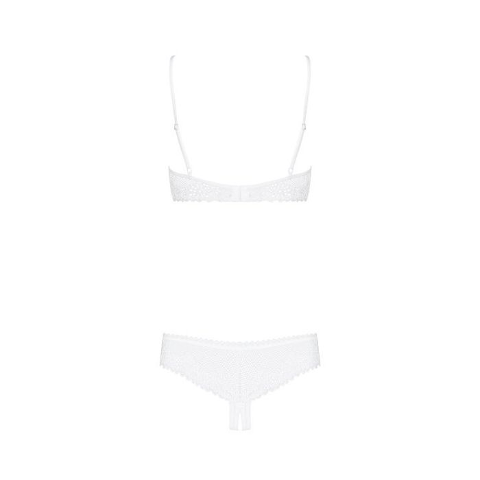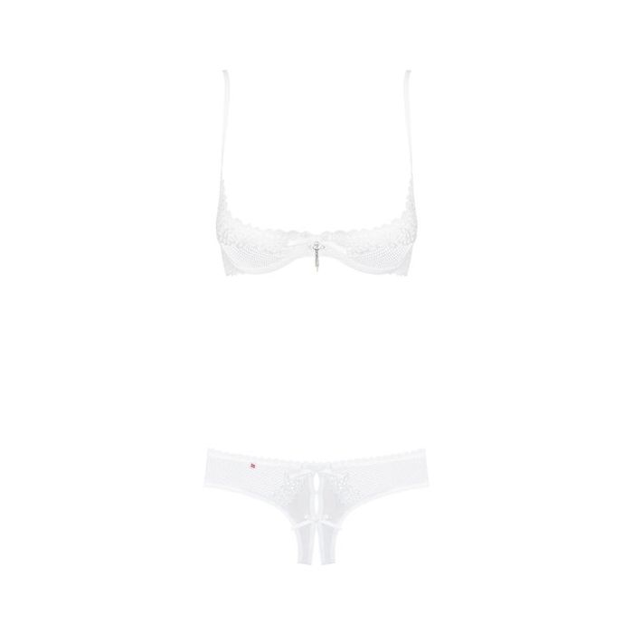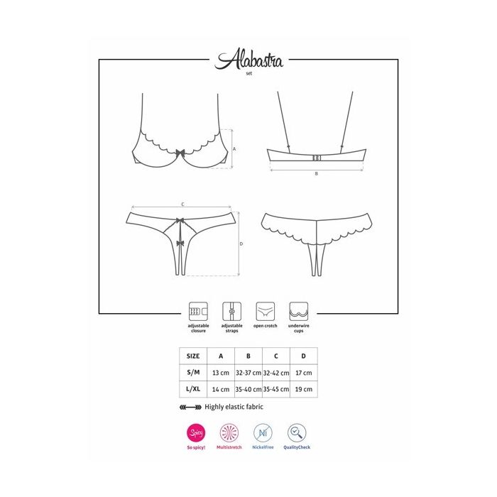 Dit sexy lingerie Alabastra Halve Cup en String set, van het merk Obsessive bestaat uit een halve bh cub en spannende open kruis string. Deze set wordt geleverd in een mooie en verrassende cadeau verpakking. Waardoor dit erg leuk is om aan jezelf te geven. om hiermee vervolgens je partner te verrassen of om aan je partner cadeau te doen.