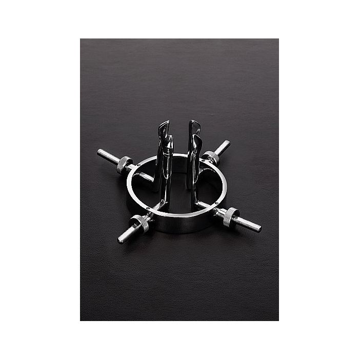 De Anaal Speculums Ring van Triune is speciaal gemaakt de extreme anale speler. Met dit bijzondere speculum krijg je gegarandeerd volledig inzicht in zijn of haar kont. In gesloten toestand worden de vier staven van het ringvormige speculum tot een diepte van ca. 9 cm de anus ingebracht. Door het gelijkmatig openschroeven wordt er nu continu strekking tot 90 mm. Daarna kun je er bijvoorbeeld een dildo inbrengen. De Anaal Speculums Ring is gemaakt van hoogwaardig roestvrijstaal. Maak het speeltje na gebruik goed schoon met één van onze toycleaners.