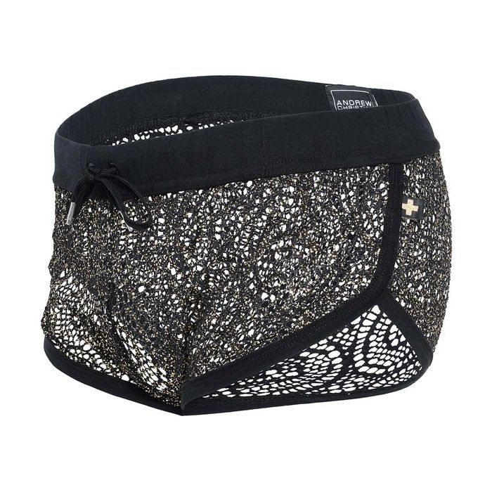De Andrew Christian El Dorado Short is een sportieve en tegelijk chique short. De jogger short heeft een brede tailleband gemaakt van zacht katoen met rijgveter. Ook de zomen zijn gemaakt van zacht katoen voor een hoog draagcomfort. Het mesh met sierlijk gaten patroon is doorzichtig en er zijn goudkleurige vlokjes op aangebracht voor een sprankelend effect.