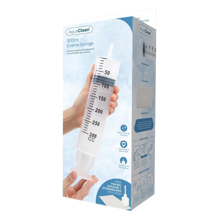 De AquaClean Klysmaspuit van 300 ml is de perfecte oplossing voor moeiteloze intieme hygiëne. Met zijn taps toelopende punt is deze klysmaspuit ontworpen voor eenvoudig en comfortabel inbrengen, zodat je je altijd fris en schoon voelt. De spuit heeft een capaciteit van maximaal 300 ml, wat zorgt voor een effectieve reiniging zonder gedoe. Bovendien wordt de set geleverd met een handige, reisvriendelijke compacte douche en een opbergzak, ideaal voor onderweg. Of je nu thuis bent of op reis, met AquaClean prioriteert je jouw hygiëne op een eenvoudige en effectieve manier. Maak van jouw persoonlijke verzorging een zorgeloze ervaring en kies voor AquaClean!