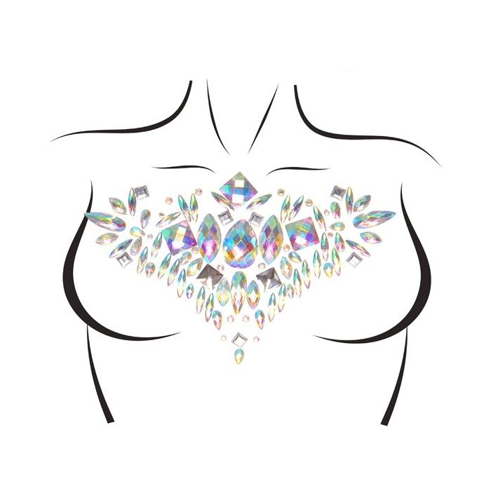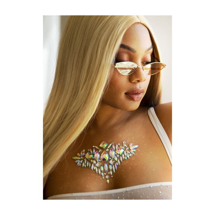 Wil jij wel eens iets anders dan een ketting om jouw decolleté mee te versieren? Ga dan voor deze feestelijke lichaamssticker. De Aura Body Jewels Sticker van Leg Avenue is een transparante sticker met een ruitvormig design waar flonkerende steentjes op zijn aangebracht. De sticker kan op de borst geplakt worden, maar kan ook op een andere plek op het lichaam aangebracht worden voor een opvallende festival look.