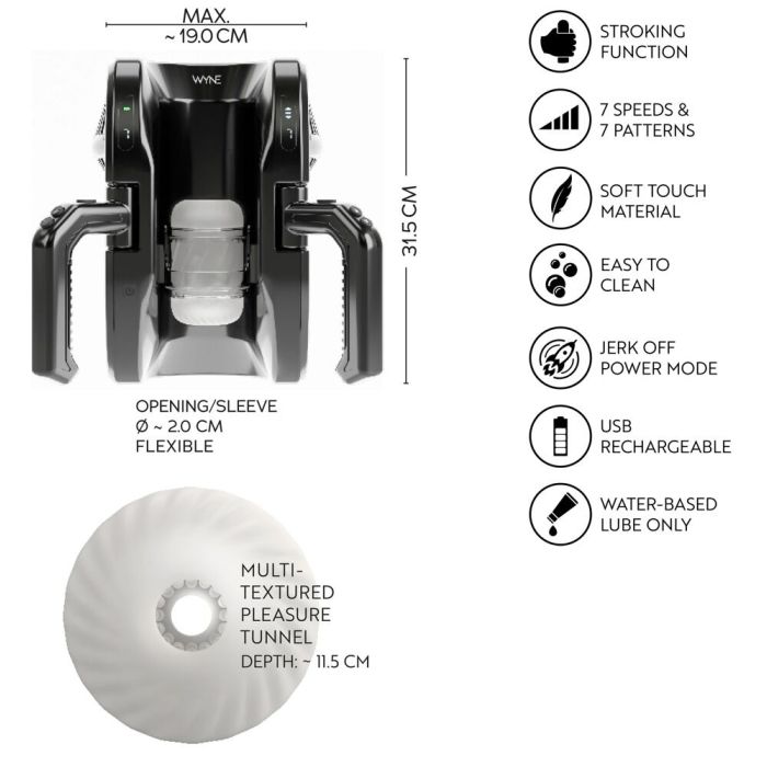 De Automatische Masturbator 10 van WYNE biedt een intensieve massage met een op-en-neer bewegende strokermouw die tot wel 28 cm lang is. Dankzij de handige handgrepen aan de zijkanten geniet je van maximaal comfort en gebruiksgemak, zodat je je kunt concentreren op wat echt belangrijk is: plezier! Met vijf verschillende slaglengtes, zeven bewegingsstanden en zeven snelheden, allemaal eenvoudig te bedienen met één druk op de knop, kun je de stimulatie precies afstemmen op jouw wensen. Of je nu gaat voor een snelle, intense ervaring of een langzame opbouw naar een onvergetelijke climax, deze masturbator heeft het allemaal. De extra zachte, rekbare sleeve is niet alleen een genot voor je penis, maar ook eenvoudig te reinigen en kan zelfs apart worden gebruikt voor een handmatige handjob. En met de bijgeleverde USB-oplaadkabel ben je altijd klaar voor een nieuwe ronde van plezier. Maak je klaar om jezelf te verwennen zoals nooit tevoren!