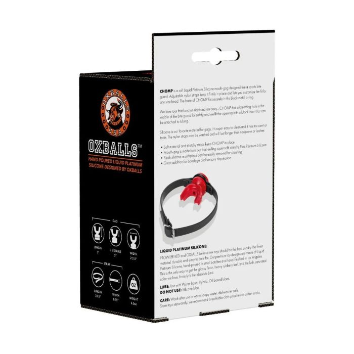 Chomp is een innovatief en veilig ballgag dat is vervaardigd uit zacht Liquid Platinum Silicone, ontworpen in de stijl van een sportbitje. Dit product is uitgerust met verstelbare nylon banden die ervoor zorgen dat het stevig op zijn plaats blijft en dat de pasvorm kan worden aangepast aan elke gezichtsgrootte. De basis van CHOMP past perfect in de zwarte metalen o-ring, wat bijdraagt aan de stabiliteit en gebruiksvriendelijkheid. Een van de belangrijkste kenmerken van dit ontwerp is de mogelijkheid voor de gebruiker om de siliconen gag eenvoudig uit de banden te verwijderen zonder gebruik van de handen, wat de veiligheid bevordert.