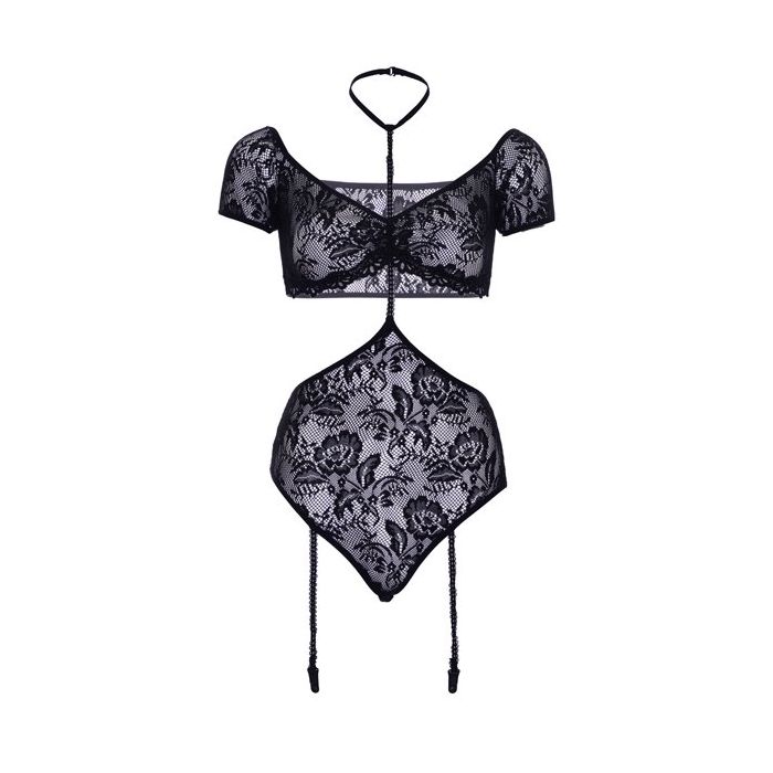 Fijnmazig netstof met romantische bloemen en een bijzonder sexy design. Dat is de Bandeau Body met Jarretels van Leg Avenue. Deze zachte stretch body bestaat uit een bandeau top en een hoge slip met halterbandje en jarretelbandjes. De bandeau bovenkant spant zich spannend rond jouw borsten en heeft korte mouwtjes. Het halterbandje zit bevestigd aan een spannende choker. Combineer de body met kousen voor een extra sexy look!