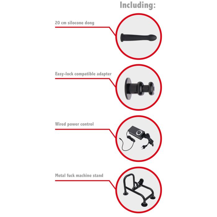 Bij de Bangers Fuck Machine wordt een siliconen dildo van 20 cm geleverd, waardoor je direct aan de slag kunt. Daarnaast wordt ook een eenvoudige adapter meegeleverd, zodat je de machine gemakkelijk kunt aansluiten op het stopcontact. Met de bedrade voedingsregeling kun je eenvoudig de snelheid en intensiteit van de slagen aanpassen naar jouw voorkeur. Om de machine op een comfortabele hoogte te gebruiken, wordt ook een metalen standaard meegeleverd.