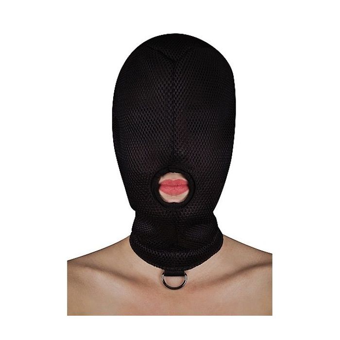 Met dit masker is je partner volledig aan je genade opgeleverd. Het zicht wordt volledig ontnomen. Dit masker heeft een D-vormige ring aan de hals waarmee je makkelijk kettingen, boeien en touwen kunt aansluiten.