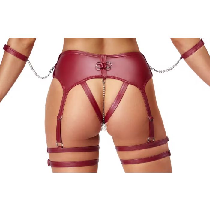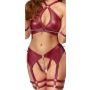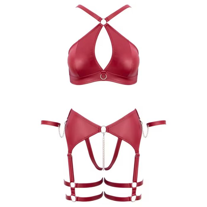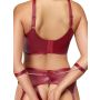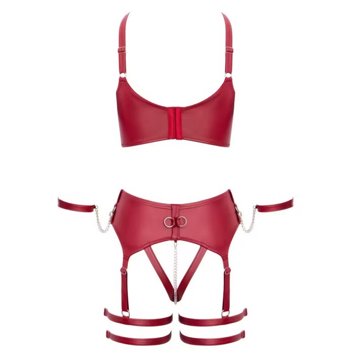 Dit spannende setje in een luxe donkerrode matte look is niet alleen een lust voor het oog, maar biedt ook comfort. De zachte beha is slim ontworpen met een ring tussen de cups, waardoor je een verleidelijke decolleté creëert. De verstelbare bandjes en haaksluiting op de rug zorgen ervoor dat je de perfecte pasvorm kunt vinden, terwijl de kruisloze jarretelkoord met dubbele dijbeenbandjes een ondeugende flair toevoegt.