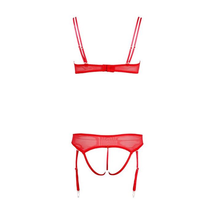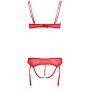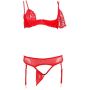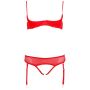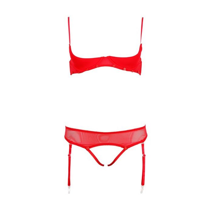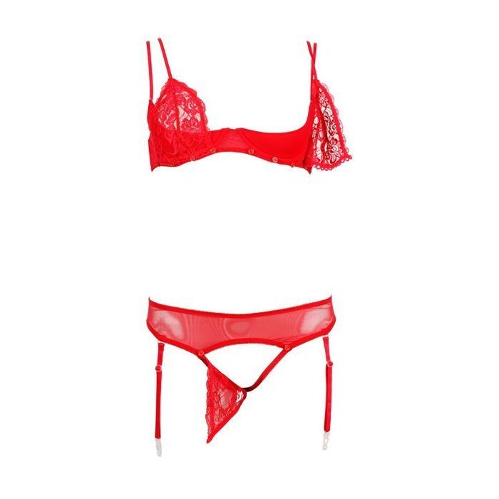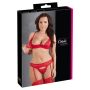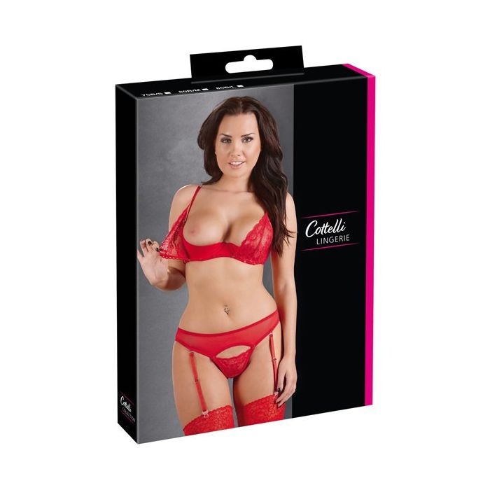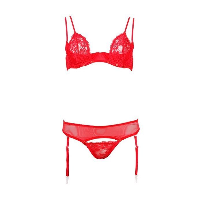Dit opvallende rode setje uit de Cottelli Collection bestaat uit een bh en een string met jarretels. De bh heeft halve voorgevormde cups met afneembare cups van doorzichtig rood kant eroverheen. Met de afneembare cups kun je je partner heerlijk plagen en gek maken van verlangen. Zo is ook het kruis van de bijpassende string afneembaar voor spannende spelletjes. De bh is voorzien van verstelbare schouderbandjes en de verstelbare jarretelbandjes aan de string zijn afneembaar. In deze set kun je een opwindende stripact opvoeren en creatief spelen met de afneembare delen.