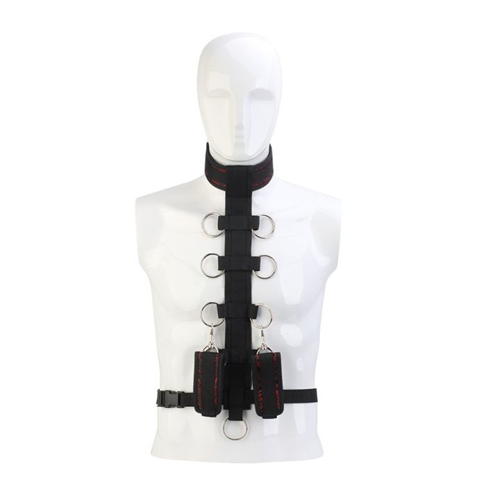 Met deze geweldige lichaamgordel met afneembare kraag en handboeien ben jij klaar voor een kinky bdsm avondje. De body collar blaze deluxe is voorzien van rode borduursels voor een mooie afwerking. Het kan aan de voorkant en aan de achterkant van het lichaam worden gedragen. De halsband en de handboeien zijn op maat verstelbaar met de klittenband sluitingen, de band in de taille verstel jij het met de gespsluiting. De 9 O-ringen zijn geschikt om andere bdsm accessoires zoals kettingen en gewichten te bevestigen.