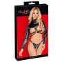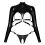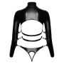 Dit boeiende setje in een stuk is een absolute blikvanger! Het extravagante zwarte bondage setje van Bad Kitty bestaat uit een borstloos shirt en een kruisloze string. Gemaakt van zacht elastisch imitatieleer met verstelbare geklonken bandjes, biedt dit setje een perfecte pasvorm en comfort. Het shirt heeft een opstaande kraag met een ring aan de voorkant, wat een speels en verleidelijk effect geeft. Daarnaast zijn er zijringen aanwezig voor de bevestiging van karabiners aan de binnenkant van de mouwen, waardoor je de mogelijkheid hebt om extra accessoires toe te voegen.