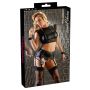 Wees kinky met deze kinky Bondage Set met Top en Jarretel slip. De set is voorzien van handboeien om je bdsm look extra kracht bi te zetten. De top en slip zijn gemaakt van een combinatie van wetlook met zacht bloemetjeskant voor een romantische look. De top kan over beide borsten volledig open geknoopt worden zodat jij je borsten eruit kan laten springen. Letterlijk en figuurlijk..... De jarretel slip heeft een open kruis voor onmiddellijke toegang en verstelbare jarretel bandjes zodat deze perfect zullen aansluiten op je kousen. Aan de zijkant van de jarretel slip zitten de handboeien die jij optioneel kan gebruiken.