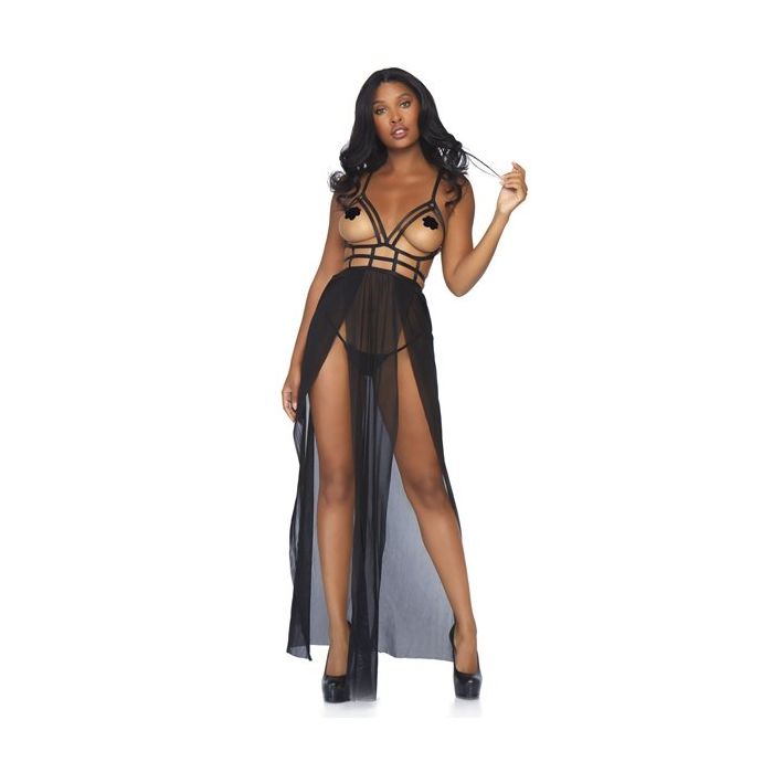 De Cage Bodice Maxi Dress - Zwart is een spannende en tegelijk elegante lange jurk. Cage Bodice betekend letterlijk kooi lijfje en het lijfje is dan ook gemaakt van stijlvolle bandjes die een kooi om je bovenlichaam vormen voor een kinky effect. De cups zijn open zodat jij goed kunt pronken met je borsten.