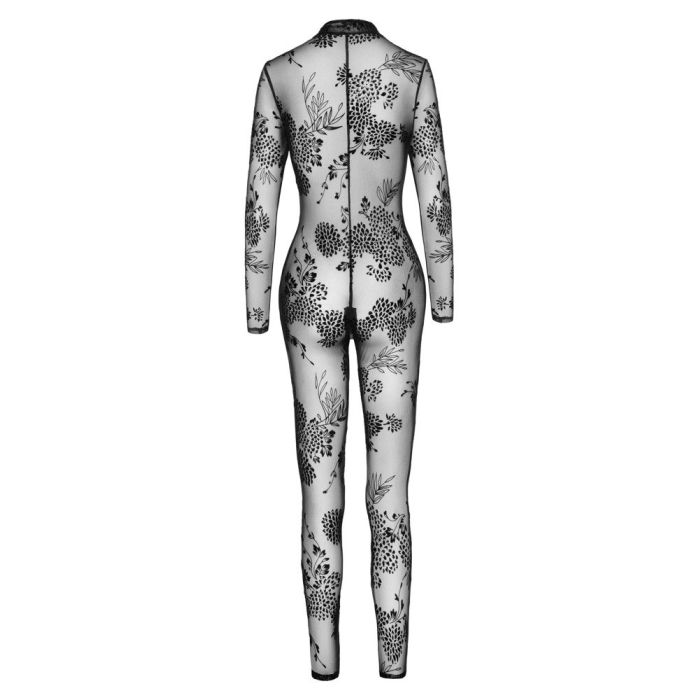 Deze verleidelijke catsuit van Noir Handmade is gemaakt van rekbare ondoorzichtige stof. Het materiaal is afgewerkt met een fluwelen flockprint. Aan de voorkant is een rits ingezet die loopt van de hals tot aan het kruis.