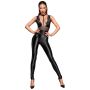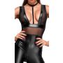 Deze kinky catsuit geeft jou de bdsm look die jij nodig bent om je sub te domineren in de perfecte outfit. De body heeft een strakke fitting en sluit volledig aan op het lichaam. Door het elastische materiaal heeft de catsuit een geweldige pasvorm voor elk lichaam. Op het midden en over de borsten heen is de catsuit voorzien van transparante powernet inzetstukken waar de huid licht doorheen is te zien voor een sexy look. Vanaf het diepe decolleté naar boven is een fluwelen verstelbaar bandje bevestigd welke sluit achterin de nek. Voor de echte bdsm liefhebbers. Trek je stoutste pumps erbij aan en jij staat gegarandeerd in de schijnwerpers.