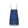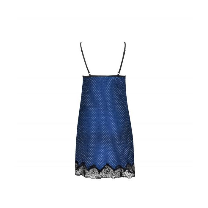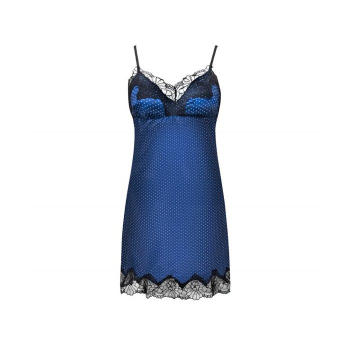 De charmante Chagall Chemise is een soepel vallend A-model nachtjurkje uit de Secret Garden Collection van het merk Livco Corsetti. Het jurkje is gemaakt van gladde blauwe stof met een speels wit polka dot patroon. De chemise is over het decolleté en onderaan het jurkje afgewerkt met luxe zwart kant voor een romantisch tintje.