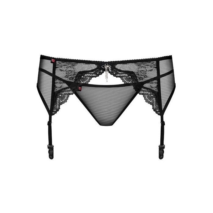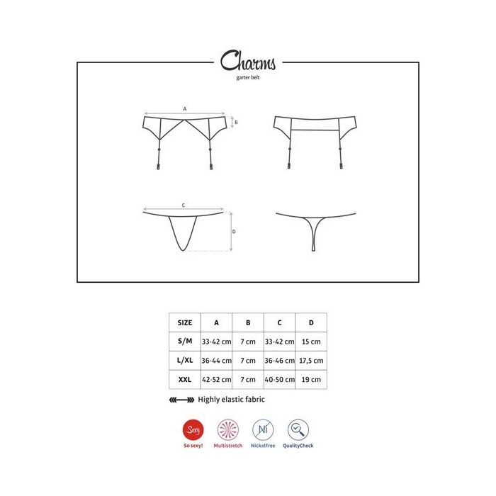Gooi je charmes in de strijd met een beetje hulp van de Charms Jarretel en String Set - Zwart van het merk Obsessive. In dit spannende setje zul jij je extra sexy voelen en dit straal je dan ook zeker uit wanneer je verschijnt in deze prachtige jarretel set. De jarretelgordel is voorzien van 4 verstelbare jarretelbandjes en is gemaakt van doorschijnend tule en sierlijk kant met geschulpte randjes. Aan de voorkant is de jarretelgordel afgewerkt met een sieraad voor een elegante uitstraling. De string is geheel zwart, maar net als de jarretel heerlijk zacht en soepel. Combineer de set met bijpassende kousen voor een complete sexy look.