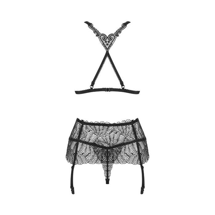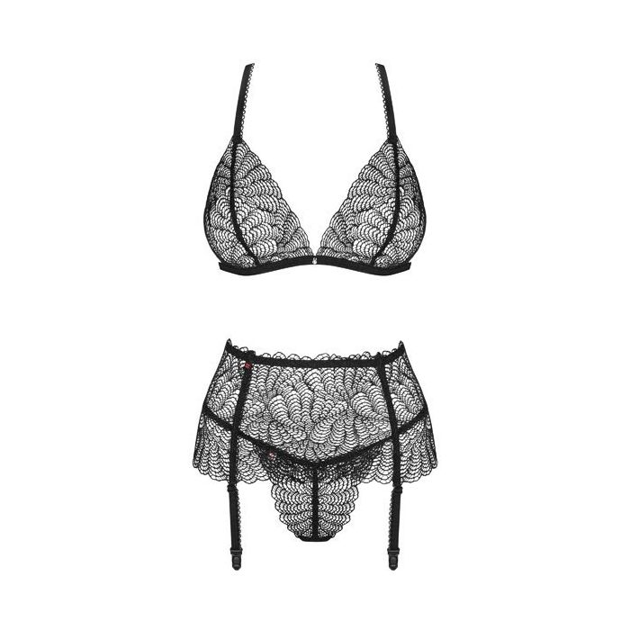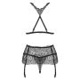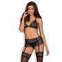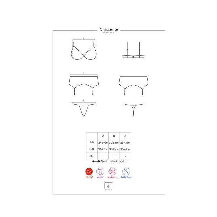 Ga voor een sensuele look met de Chiccanta Jarretel Set - Zwart. Deze luxe 3-delige lingerie set uit de collectie van Obsessive is van de hoogste kwaliteit. De set bestaat uit een bralette bh, een jarretelgordel en een string. De set is gemaakt van ragfijn kant en multistretch stof.