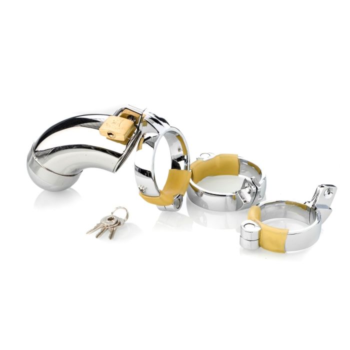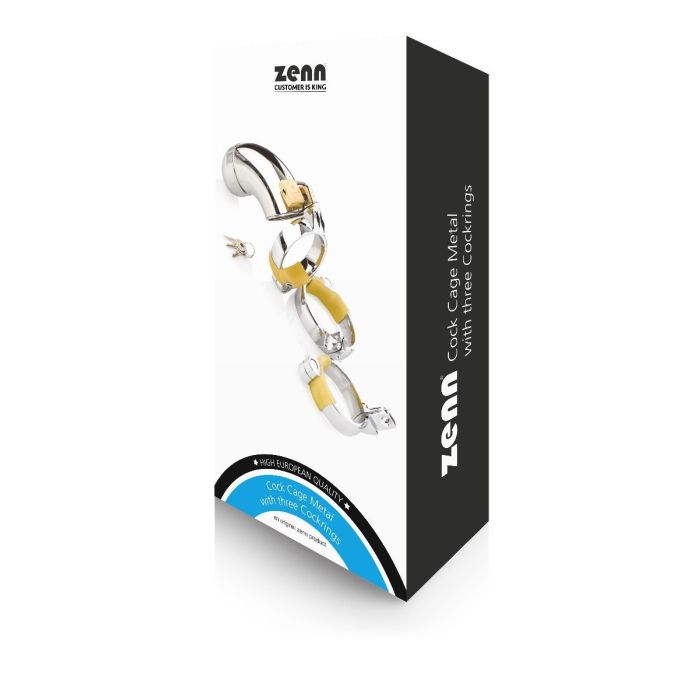 Met deze stalen peniskooi van Zenn Toys is het opsluiten van de penis nog nooit zo eenvoudig geweest. De peniskooi is 11.5 cm lang wat betekent dat uw slappe, gebogen penis tot 11.5 cm kan zijn om in deze heerlijke kooi te passen. De binnendiameter van de peniskooi is 3.5 cm en het materiaal is 2 mm dun en de binnendiameters van de drie cockringen zijn 4, 4.5 en 5 cm en hebben een hoogte van 1.4 cm.