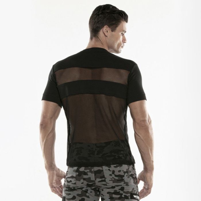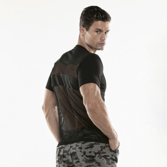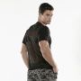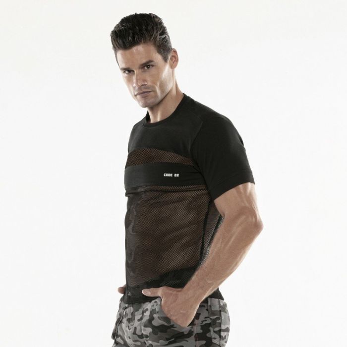 Het Cargo T-Shirt - Zwart van Code 22 is een slim fit T-shirt gemaakt van zachte materialen. De mouwen en de schouderpartij zijn gemaakt van zwarte stretch stof. De voor- en achterkant van het T-shirt zijn gemaakt van semi-transparant sport mesh. Hierin is jouw gespierde torso goed te zien.