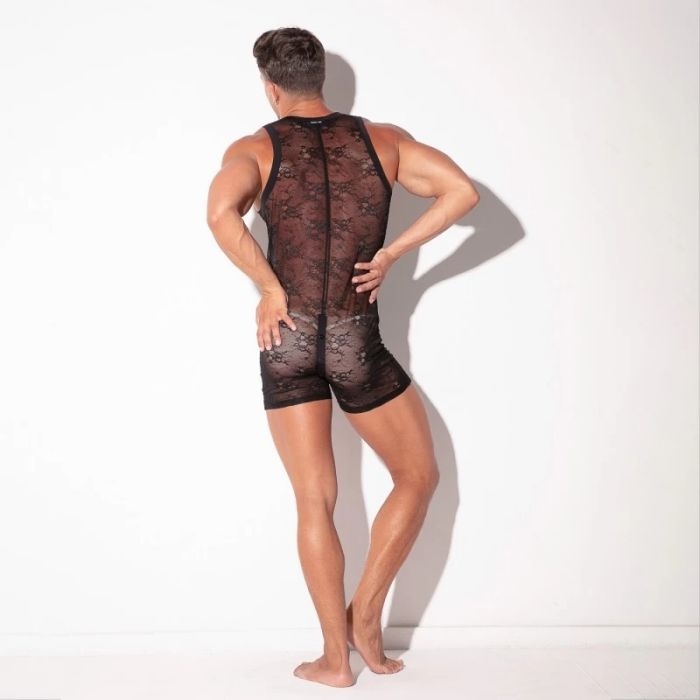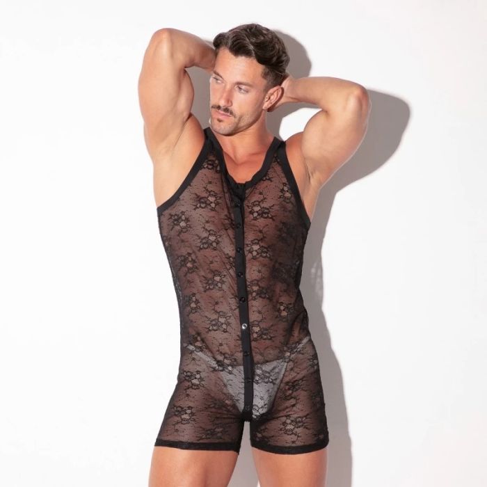 Maak een gedurfde indruk met de Code 22 Kanten Heren Jumpsuit in zwart. Deze prachtige jumpsuit is vervaardigd uit lichtgewicht bloemenkant, dat niet alleen een zachte textuur biedt, maar ook een vleugje elegantie toevoegt aan je outfit. Het mouwloze ontwerp en de korte pijpen zorgen voor een frisse en moderne uitstraling, perfect voor zowel casual als chique gelegenheden. De drukknoopsluiting, die van voor naar achter loopt, voegt niet alleen functionaliteit toe, maar geeft ook een provocerende twist aan het geheel. Met een slanke pasvorm die je figuur accentueert, is deze jumpsuit ideaal als statement piece of om te combineren met andere kledingstukken. Voeg deze veelzijdige jumpsuit toe aan je garderobe en laat je stijl spreken!