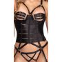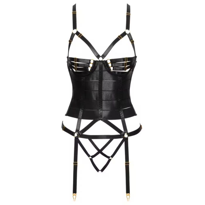 Dit stijlvolle ensemble is ontworpen met een gedetailleerde afwerking en elastische banden die een geraffineerde satijnen look uitstralen. De gouden accessoires voegen een vleugje luxe toe, terwijl het zachte en soepele materiaal zorgt voor maximaal comfort, zodat je je de hele avond zelfverzekerd en sexy voelt. De corsage is uitgerust met geïntegreerde voorgevormde baleinen die je figuur prachtig accentueren en een verstelbare haaksluiting op de rug biedt de mogelijkheid om de pasvorm perfect af te stemmen op jouw lichaam.