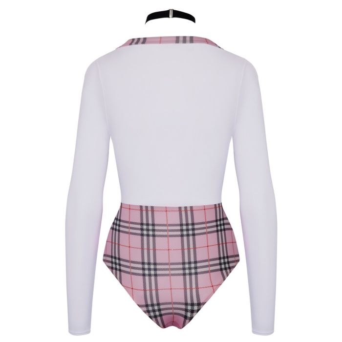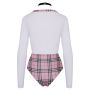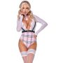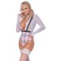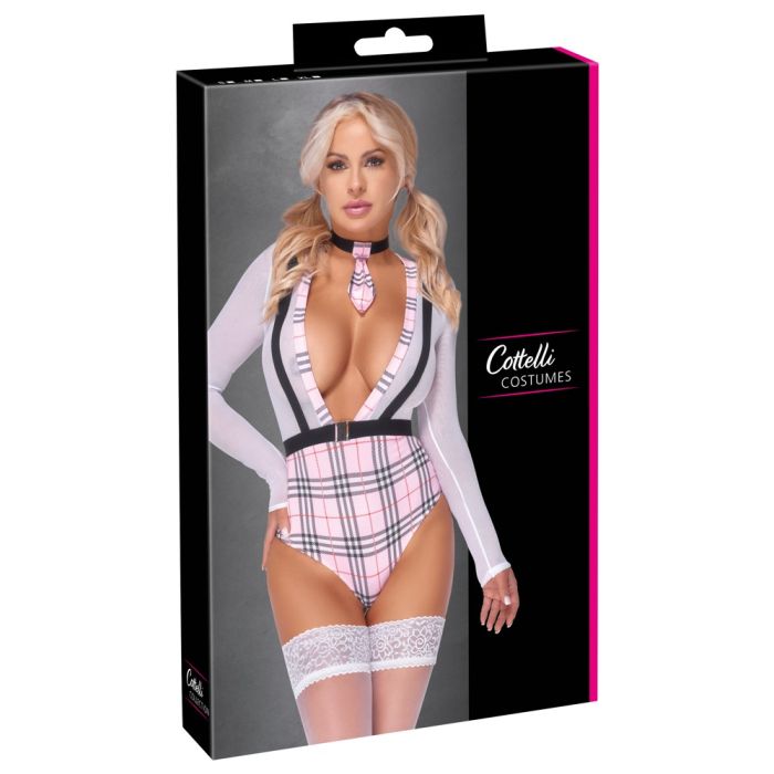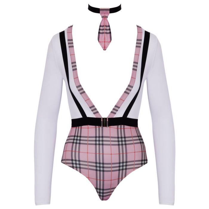 De extra laag uitgesneden bodysuit heeft aangehechte stretchbanden aan de voorzijde in bretellook, wat zorgt voor een extra sexy touch. Daarnaast is er een aangehechte ceintuur aan de voorzijde met een mooie sluiting, evenals een halsband met een klein geruit bandje en gesp aan de hals voor een complete en ondeugende look.