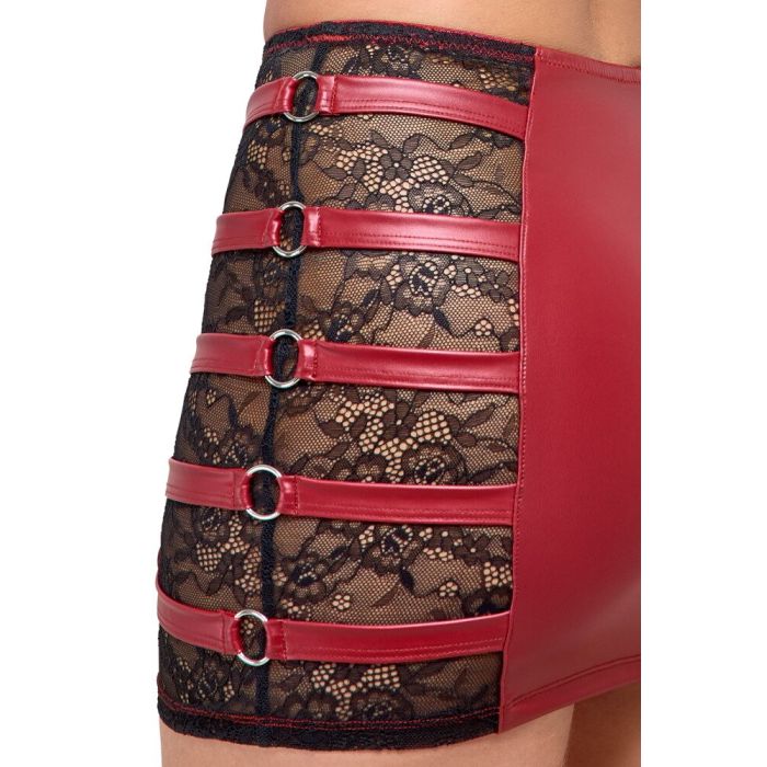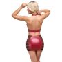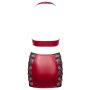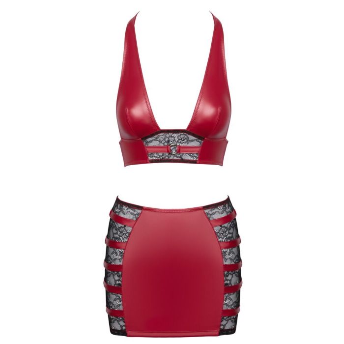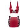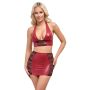 Dit prachtige setje van Cottelli PARTY combineert stijlvolle wetlook met kant voor een sexy en elegante uitstraling. De cropped haltertop en strakke minirok zijn beide gemaakt van een rode wetlook stof met zwarte kanten inzetstukken. De stijlvolle bandjes met zilverkleurige ringen voegen een extra vleugje glamour toe aan het geheel. De zachte en elastische materialen zorgen voor maximaal comfort, zodat je je de hele avond zelfverzekerd en comfortabel voelt. De haltertop heeft een open rug en sluit met een handige drukknoop in de nek. Het kanten inzetstuk aan de voorkant voegt een verleidelijk detail toe aan de top. De korte rok is voorzien van bandjes die versierd zijn met kanten inzetstukken aan elke kant, wat zorgt voor een speels en sensueel effect. De combinatie van de rode wetlook en zwarte kant zorgt voor een opvallende en trendy look die perfect is voor een avondje uit of een speciale gelegenheid. Gemaakt van hoogwaardige materialen zoals polyester, elastaan en polyamide, is dit setje niet alleen stijlvol maar ook duurzaam en van goede kwaliteit. Of je nu naar een feestje gaat of gewoon je lingeriecollectie wilt uitbreiden met iets speciaals, dit setje van Cottelli PARTY is een must-have. Voel je sexy, zelfverzekerd en elegant in dit prachtige ensemble dat zeker de aandacht zal trekken en bewonderende blikken zal oogsten.