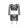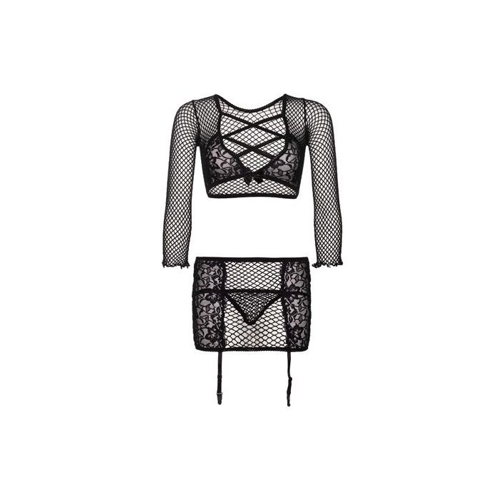 Dit spannende setje gemaakt van industrieel net stof en sierlijk kant geeft je liefdesleven zeker een boost. De Crop Top String en Jarretel Rokje lingerie set is gemaakt van zachte materialen met een hoge rekbaarheid. Het netstof geeft een uitdagende look en het kant maakt de set zacht en vrouwelijk. Aan het korte rokje zijn verstelbare jarretelbandjes gehecht zodat de set makkelijk te combineren is met kousen voor een complete sexy lingerie set.