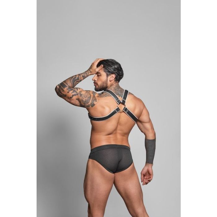 Wat dit harnas echt bijzonder maakt, is het gebruik van vegan imitatieleer. Dit materiaal biedt niet alleen een hoog draagcomfort, maar is ook een duurzame keuze voor de milieubewuste man. Je kunt met een gerust hart genieten van de stijl en het comfort, wetende dat je een product draagt dat vriendelijk is voor dieren en het milieu. Het harnas is ontworpen om goed te passen en je bewegingen niet te belemmeren, zodat je je vrij kunt voelen, ongeacht de gelegenheid.