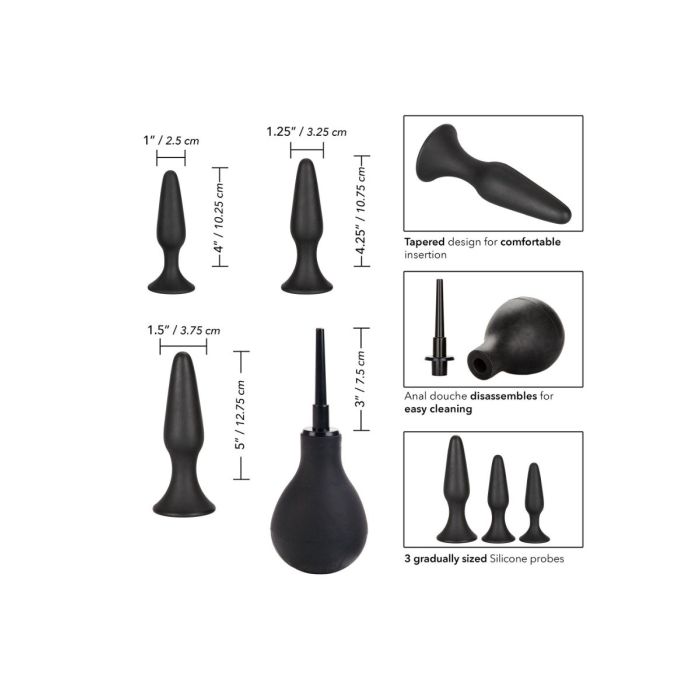 De Ultimate Anal Kit is een set die geschikt is voor zowel de beginnende als de ervaren gebruiker. Deze kinky kit bevat een set van 3 spannende anaal pluggen en een grote anaal douche om je veilig en comfortabel te laten genieten van gepassioneerde anale stimulatie. Elke anaal plug heeft een andere omvang, zodat je hiermee zelf gemakkelijk bepaalt in welke mate de wereld van anale seks verkend wordt. De flexibele plugs zijn gemaakt van hygiënisch en hoogwaardige siliconen voor een optimaal draagcomfort.