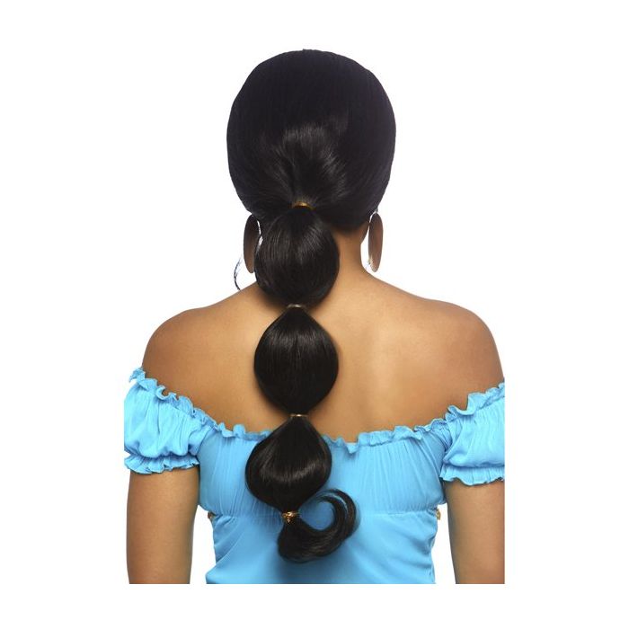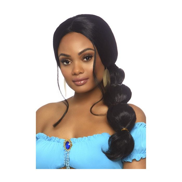 Verkleed je als de geliefde prinses Yasmine met de Desert Princess Pruik - Zwart van Leg Avenue. Deze lange zwarte pruik is gemaakt van glanzende vezels en is afgewerkt met plukjes voor ene goudkleurige elastiekjes.