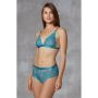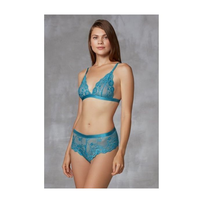De bralette en hipster zijn beiden gemaakt van sierlijk bloemen kant in een betoverend blauwe kleur. Het kant schijnt verleidelijk door en heeft speels geschulpte randen. De bralette heeft ongevoerde triangel cups zonder beugels en heeft een elastische band rondom voor steun. De bralette heeft verstelbare bandjes en een sluiting op de rug. De hipster heeft een met katoen gevoerd kruisje.