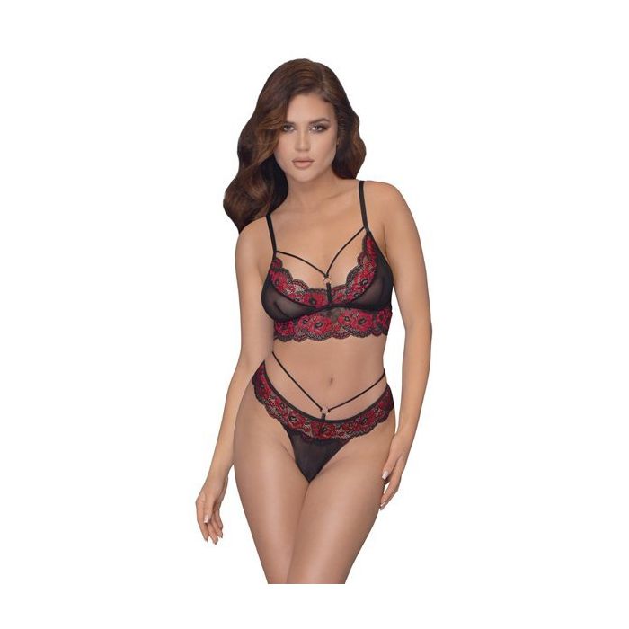 De tweedelige Double Fun Lingerie Set komt uit de lingerie lijn van Cottelli Collection. Deze spannende set is gemaakt van sierlijk stretch kant en semi-transparant mesh en bestaat uit een bralette bh en een spannende string. De top en de string zijn voorzien van stretch en afgewerkt met speelse bandjes en metalen ringen.