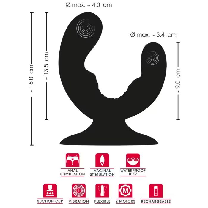 Dit innovatieve speeltje combineert een grotere en een kleinere vibrator in één gebogen ontwerp, perfect voor een ongeëvenaarde ervaring. Dankzij de sterke zuigbasis kun je de vibrator stevig bevestigen aan gladde oppervlakken, waardoor je kunt genieten van hands-free genot. Of je nu kiest voor een zacht wiegen, intens wrijven of diep genot, deze vibrator biedt het allemaal. De flexibele vorm is ideaal voor gelijktijdige vaginale en anale stimulatie.