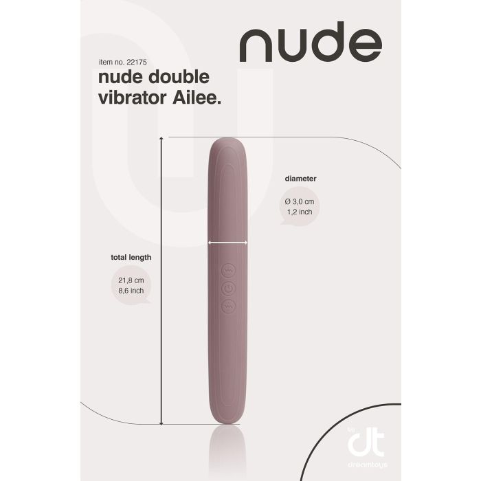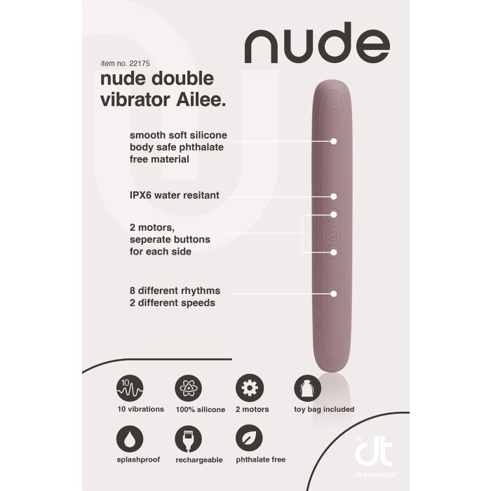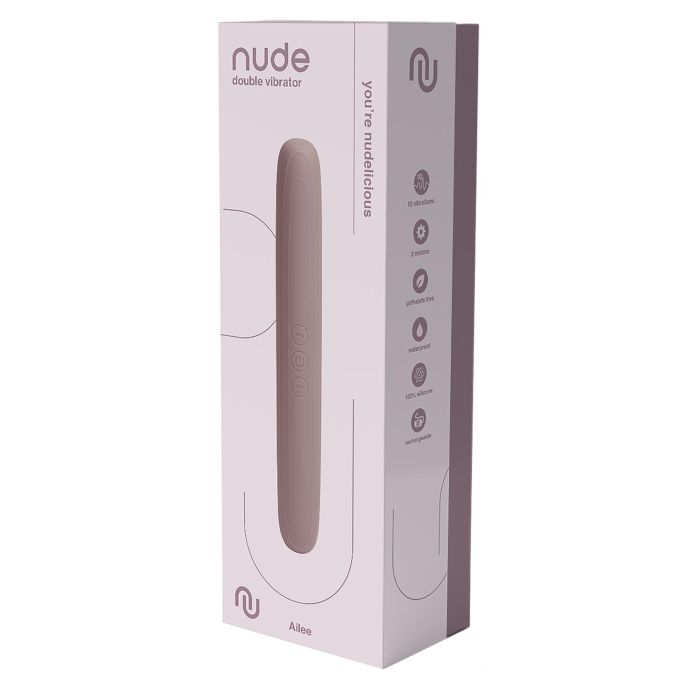 Maak kennis met Ailee van Nude, de dubbele vibrator die jouw genot naar nieuwe hoogten zal brengen, of je nu alleen bent of samen met een partner! Ailee is gemaakt van zachte siliconen en ABS, met twee onafhankelijk werkende kanten, elk met 10 krachtige vibraties - 8 ritmische patronen en 2 snelheden.