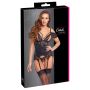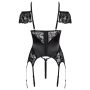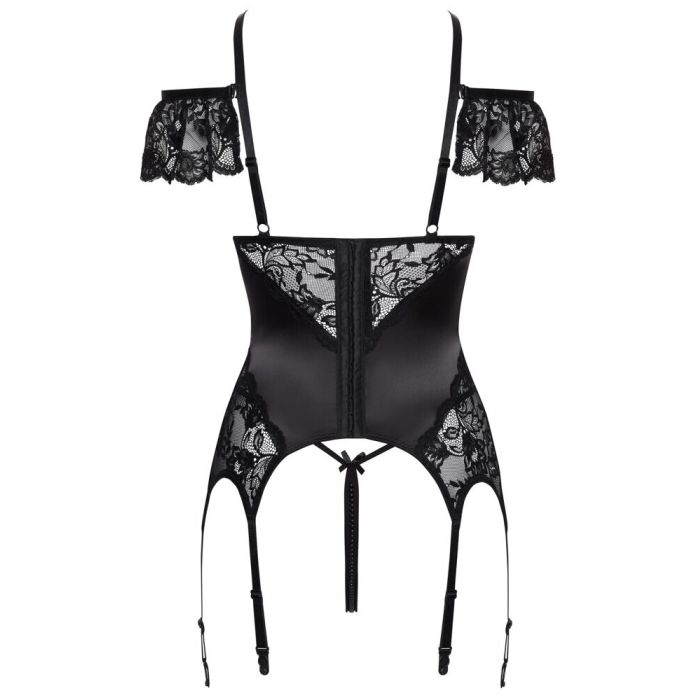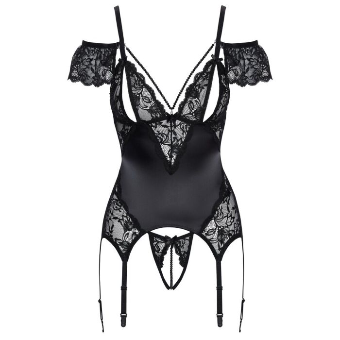 Dit prachtige setje is vervaardigd uit een geraffineerde combinatie van zwarte satijn en fijn kant, waardoor het niet alleen een lust voor het oog is, maar ook een genot om te dragen. De delicate strikjes voegen een speelse touch toe, terwijl de afneembare parelkettingen tussen de splitcups een extra vleugje glamour geven. Geniet van ultiem comfort dankzij de zachte en elastische materialen, en pas het geheel aan jouw lichaam aan met de verstelbare bandjes en de dubbele haaksluiting aan de achterkant. De kleine kanten mouwtjes zijn ook verwijderbaar, zodat je de look kunt aanpassen aan elke gelegenheid. De kruisloze string, die verleidt met een stimulerende parelketting, is open bij het kruis en zorgt voor een ondeugende verrassing. Dit setje is de perfecte keuze voor een speciale avond of om jezelf gewoon eens te verwennen!
