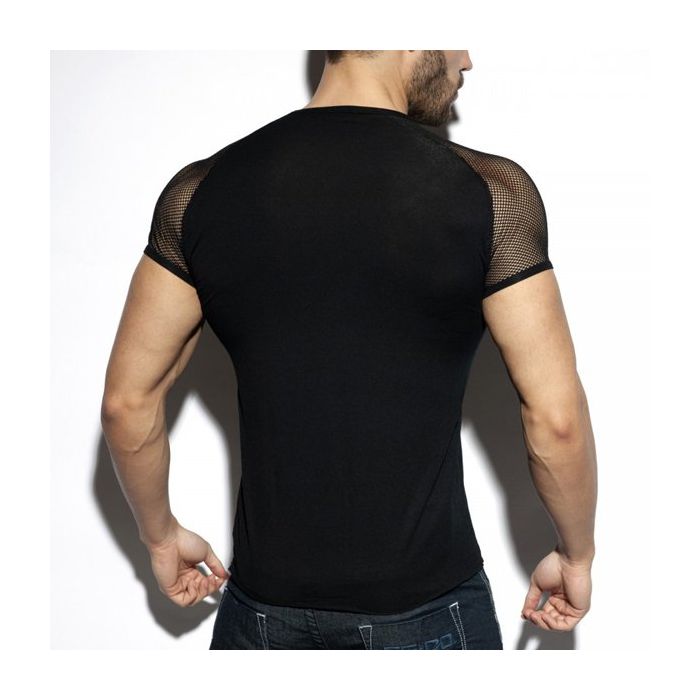 Het Ranglan Mesh T-Shirt - Zwart van ES Collection is een stijlvolle basic. Dit t-shirt heeft een basic model met een korte mouwen van mesh als sexy detail. Op de borst is het ES logo gedrukt in glanzend zwarte letters.