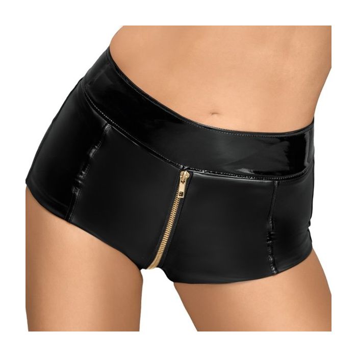De Extremely Hot Pants heeft aan de voorkant een goudkleurige 2-way rits. De rits loopt vanaf de voorkant over het kruis helemaal tot over je billen naar een driehoekige uitsparing. Dit geeft de achterkant een uitdagende look.