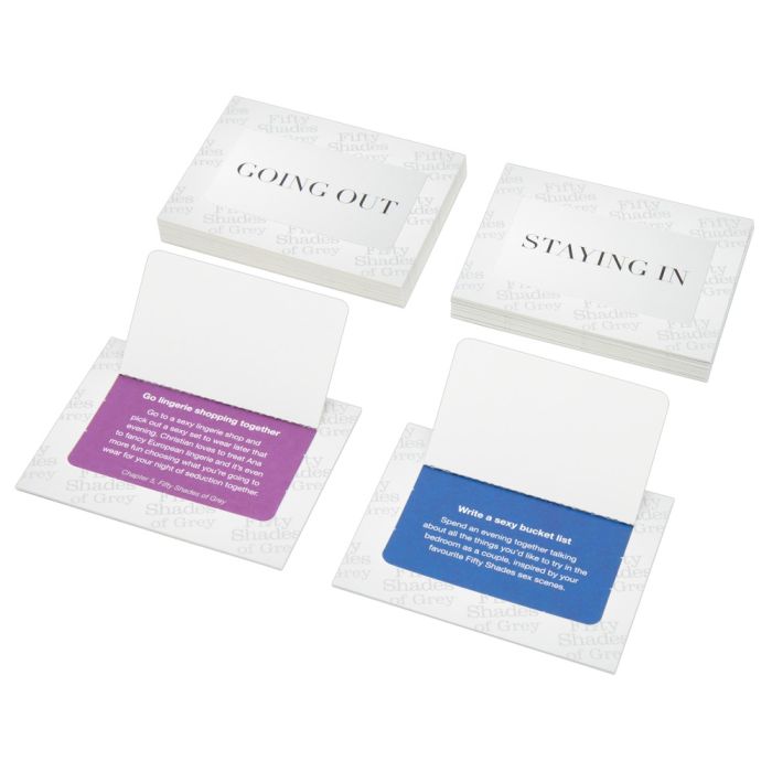 Laat de romantiek bloeien en ga op avontuur à la Ana en Christian! Dit kaartspel Play Nice Date Night Idea Cards van Fifty Shades of Grey is de perfecte inspiratie voor intense romantiek en erotische avonturen! De 52 speelkaarten zijn onderverdeeld in 2 categorieën: Staying In (we blijven thuis) & Going Out (we gaan uit). Bij staying in kun je denken aan ontbijt op bed of samen lekker knus douchen. Daarentegen kun je bij going out denken aan zoenen in de lift of samen naar de zonsondergang kijken.